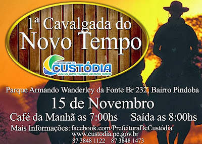 Cavalgada – A cidade de Custódia se prepara para a primeira Cavalgada do Novo Tempo, que vai acontecer neste feriado nacional (15), Várias caravanas já confirmaram presença ao evento que reúne vaqueiros de todos os lugares e idades. O prefeito Luiz Carlos, recepcionará os participantes, servindo um café da manhã no parque de exposição de Custódia Armando Wanderley da Fonte, que fica localizado as margens da BR 232. A cavalgada terá um percurso de aproximadamente de 35km e a saída está marcada para as 8:00.