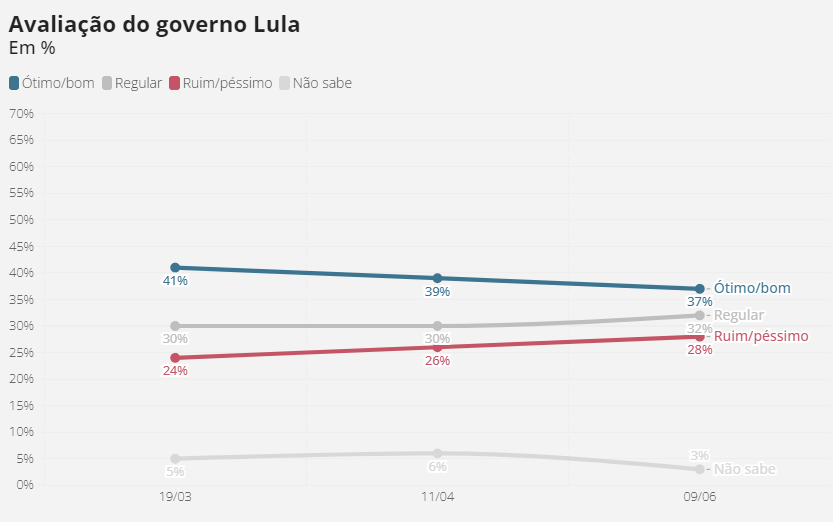 Em relação à pesquisa anterior, divulgada em 11 de abril, a avaliação positiva de Lula oscilou dois pontos percentuais para baixo, passando de 39% para 37%. Já a reprovação oscilou dois pontos para cima, de 26% para 28%.