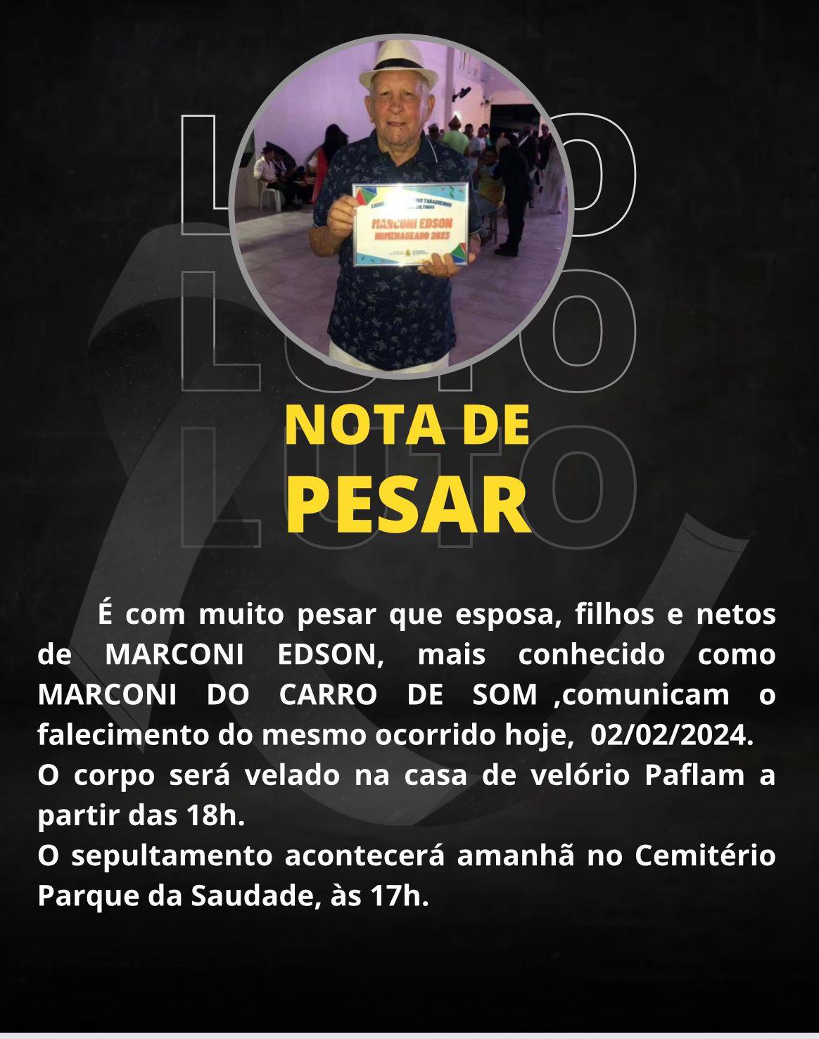 Sepultamento de Marcone Edson será neste sábado