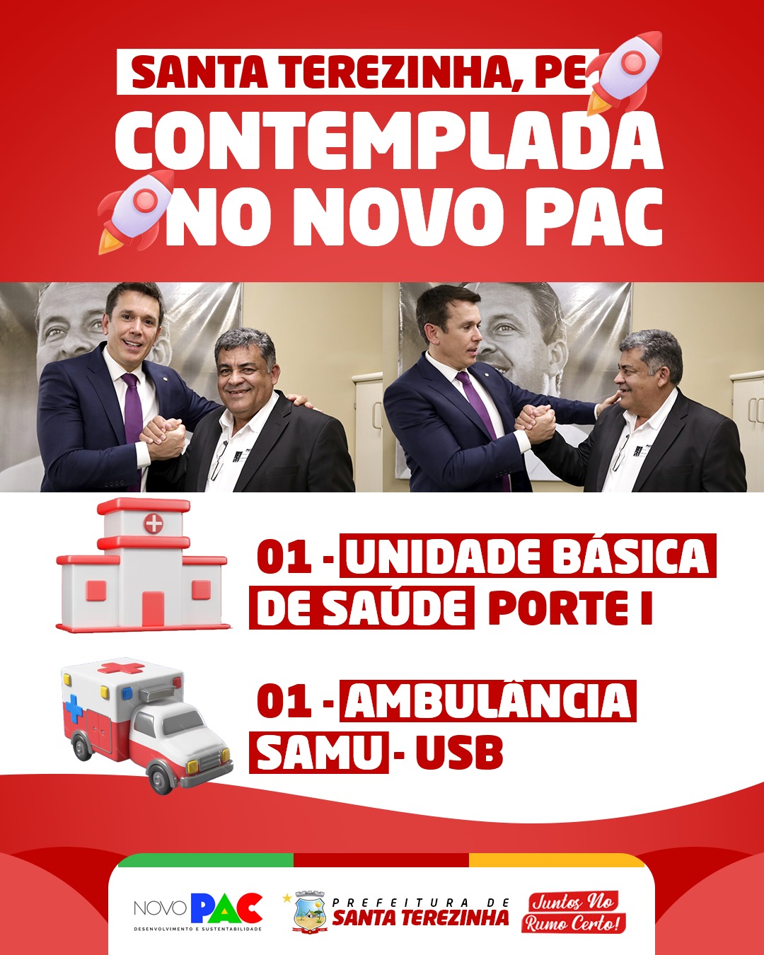Contemplado – O prefeito de Santa Terezinha, Delson Lustosa, anunciou que seu município foi contemplado com investimentos do novo PAC, anunciado pelo Presidente Lula e vai receber 01 ambulância SAMU – USB e 01 Unidade Básica de Saúde (UBS) Porte I. “Quero aqui agradecer imensamente ao nosso Deputado Federal Felipe Carreras, pela sua importante parceria na conquista desses recursos, que fortalecerão a atenção básica e o atendimento de urgência e emergência em nossa cidade”, disse o prefeito Delson.