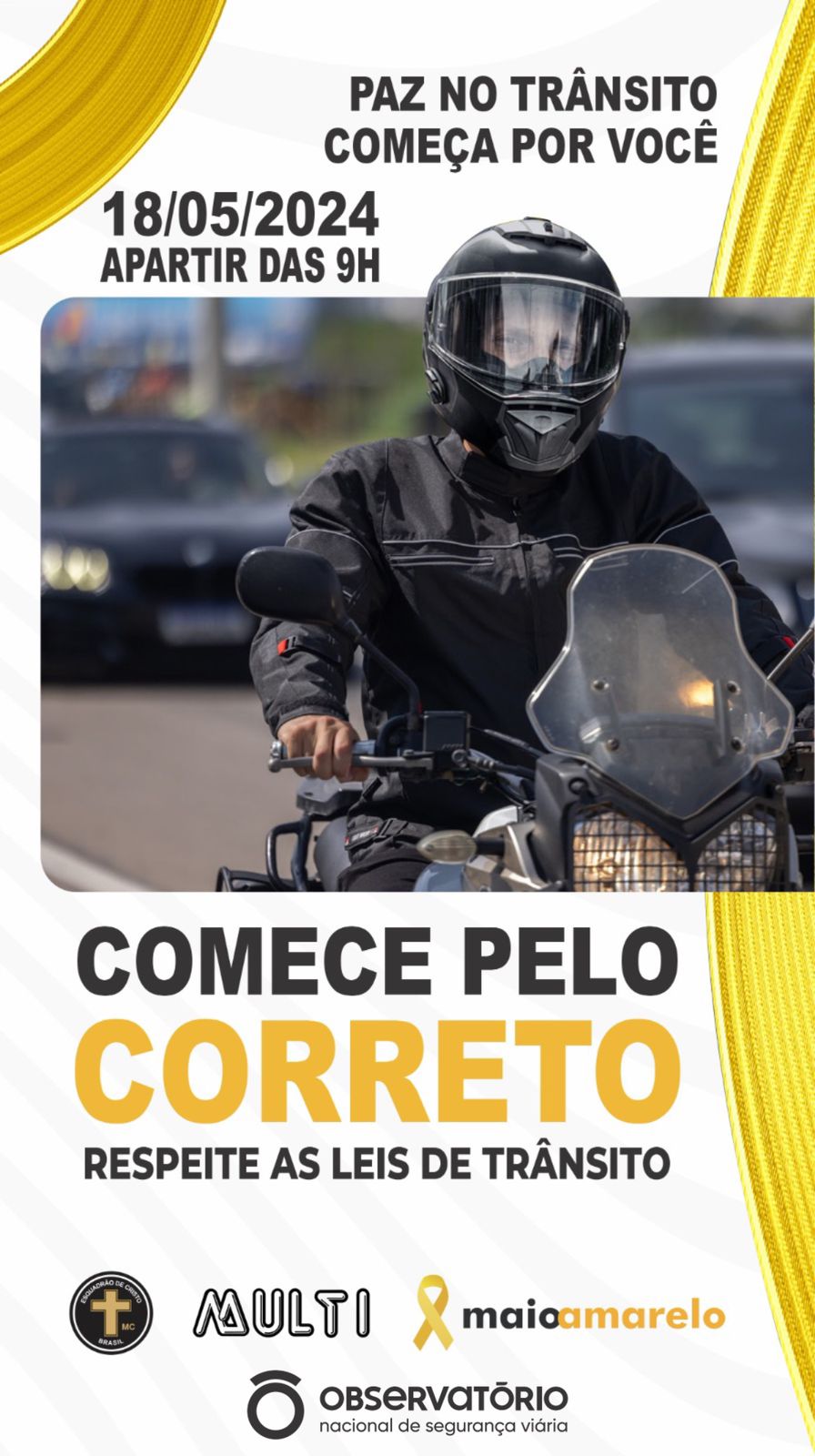 No mês de maio há um movimento internacional de conscientização para redução de acidentes de trânsito, conhecido como Maio Amarelo. O tema para 2024 é “Paz no trânsito começa por você”. Pensando no bem estar de todos o Moto Clube Esquadrão de Cristo representação Afogados da Ingazeira junto com Ministério Mult da Igreja Batista Vida Plena e Moto Clubes: Lagartos do Pajeú MC, Independentes do Pajeú, MC, Mecânicos do Asfalto de Carnaíba estarão realizando uma ação de conscientização neste sábado dia 18 de maio a partir das 9 horas nos semáforos da Prefeitura e Manoel Borba, em Afogados da Ingazeira.