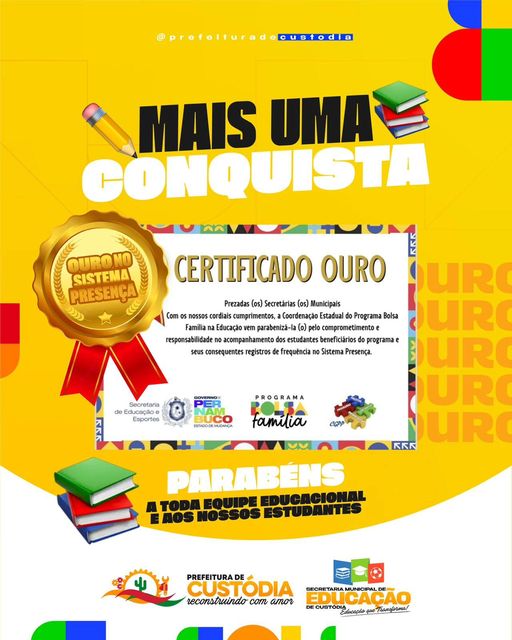 Reconhecimento – A Prefeitura de Custódia, através da Secretaria Municipal de Educação, foi mais uma vez reconhecida pelos serviços prestados a população, recebendo o Certificado Ouro pelo serviço de excelência no Sistema Presença, ofertado pela Secretaria Estadual de Educação e Esportes de Pernambuco, através da Coordenação Estadual do Programa Bolsa Família na Educação.”Esse certificado tem o comprometimento e responsabilidade no acompanhamento dos estudantes beneficiários do programa social e seus consequentes registros de frequência no Sistema Presença”, disse o prefeito Manuca.