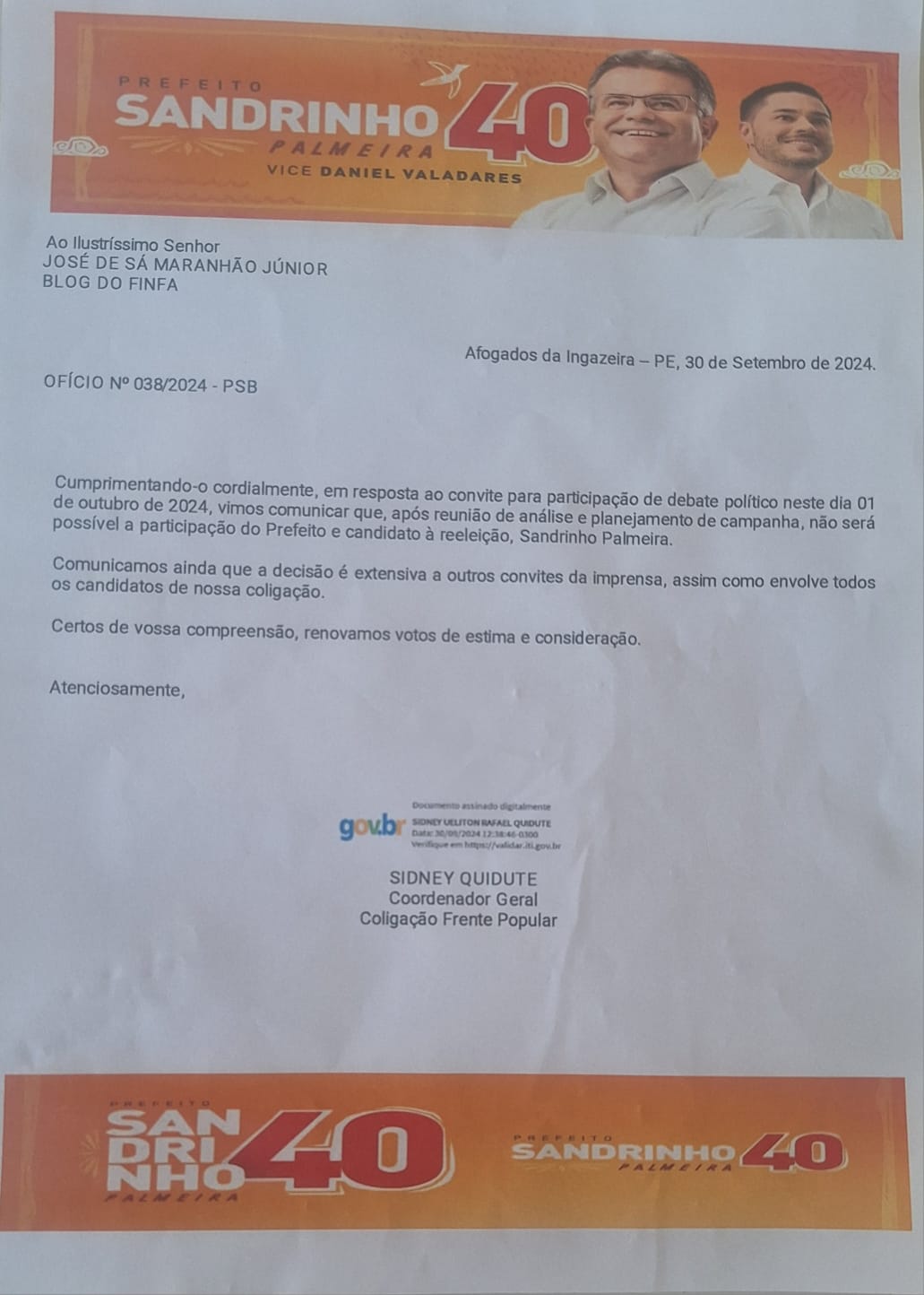 A íntegra do ofício diz que: ‘Em resposta ao convite para participação de debate político neste 1º de outubro de 2024, vimos comunicar que, após reunião de análise e planejamento de campanha, não será possível a participação do Prefeito e candidato à reeleição, Sandrinho Palmeira.