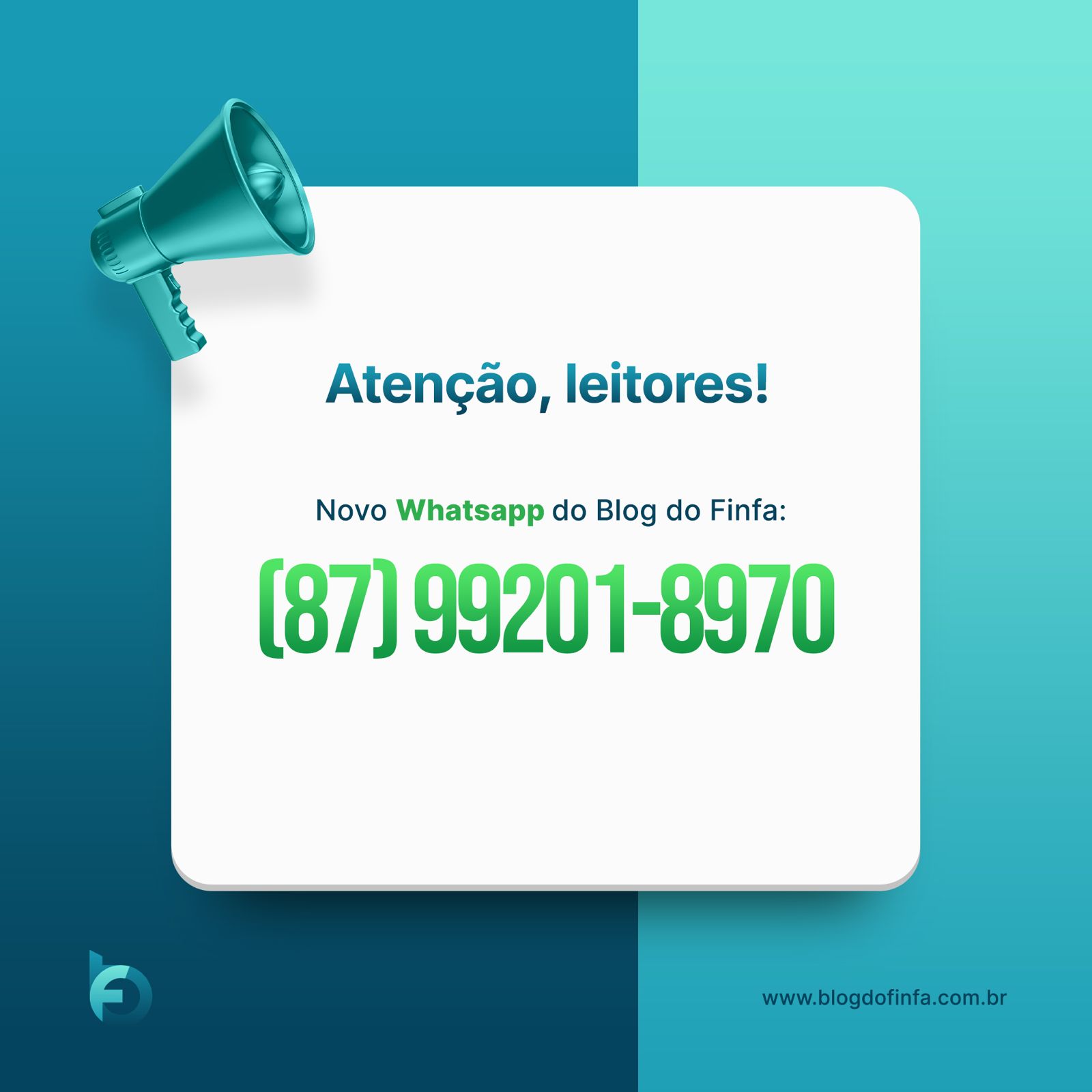 O Blog do Finfa agora está com o novo WhatsApp! Fique por dentro de todas as notícias, novidades e informações exclusivas direto na palma da sua mão. Salve o nosso contato (87) 9 9201-8970 ou clique no link (http://wa.me/+5587992018970) e envie também suas denúncias ou sugestões. Participe!