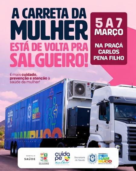 Iniciativa do Governo de Pernambuco, através do programa Cuida PE Mulher, a Carreta da Mulher Pernambucana chegou a Salgueiro pela 2ª vez em parceria com a prefeitura. Os atendimentos da unidade móvel começaram nesta quinta-feira, 5, e seguem até sábado, 7, na Praça da Academia das Cidades.