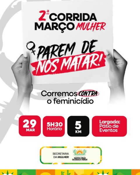 A Prefeitura de Santa Cruz da Baixa Verde, por meio da Secretaria Municipal da Mulher, promove no dia 29 de março a 2ª Corrida Março Mulher. A ação integra a programação do mês dedicado às mulheres e traz como tema “Parem de nos matar: corremos contra o feminicídio”, reforçando a luta contra a violência de gênero.