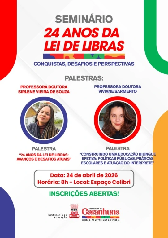 A Secretaria de Educação do Município de Garanhuns promove, na próxima sexta-feira, dia 24, o Seminário “24 anos da Lei de Libras – Conquistas, Desafios e Perspectivas”. O evento será realizado no Espaço Colibri, a partir das 8h, com oferta de 50 vagas.