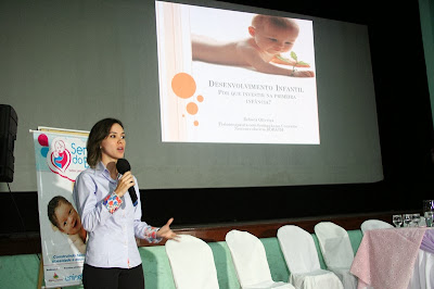 A palestra magna foi proferida pela médica Rebeca Oliveira. Ela expôs aspectos do desenvolvimento infantil e importância da participação da família nesse processo e da ação conjunto de políticas públicas de saúde, educação e assistência social.