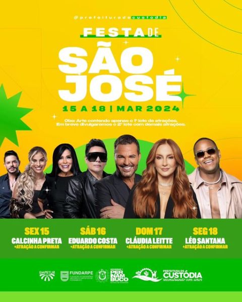Expectativa – A população custodiense está aguardando com muita expectativa, a realização da tradicional Festa de Março, quando estarão se apresentando vários artistas renomados. A festa terá início na próxima sexta-eira (15) e se encerra na segunda-feira (18). Confira aprogramação acima.