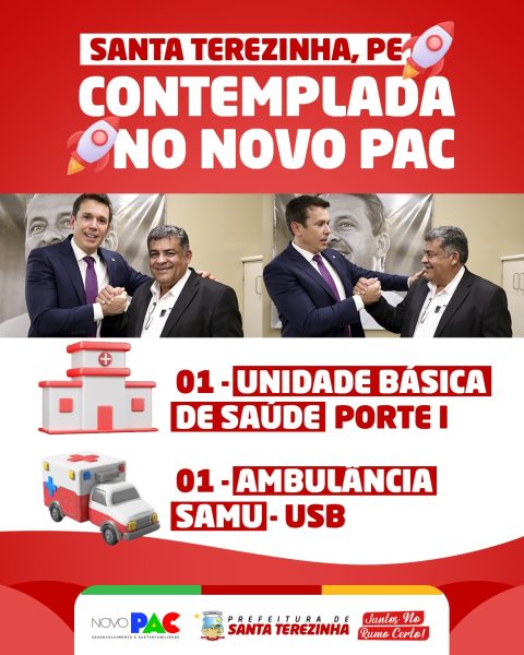 Contemplado – O prefeito de Santa Terezinha, Delson Lustosa, anunciou que seu município foi contemplado com investimentos do novo PAC, anunciado pelo Presidente Lula e vai receber 01 ambulância SAMU – USB e 01 Unidade Básica de Saúde (UBS) Porte I. “Quero aqui agradecer imensamente ao nosso Deputado Federal Felipe Carreras, pela sua importante parceria na conquista desses recursos, que fortalecerão a atenção básica e o atendimento de urgência e emergência em nossa cidade”, disse o prefeito Delson.