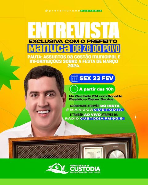 Expectativa – O prefeito de Custódia, Emmanuel Fernandes (Manuca), concede entrevista nesta sexta-feira (23), na Rádio Custódia FM aos radialistas Ronaldo Elesbão e Cleber Santos. A população custodiense aguarda com expectativa o anúncio das atrações da tradicional Festa de Março e também Manuca vai falar sobre ações da sua gestão.
