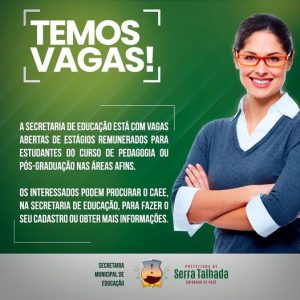 Estágio – A Prefeitura de Serra Talhada, através da Secretaria Municipal de Educação, publicou nota que está precisando de esta Estágio: A nossa Rede Municipal de Ensino tem! Vem aprender mais sobre a profissão que forma todas as profissões em parceria com o nosso time!