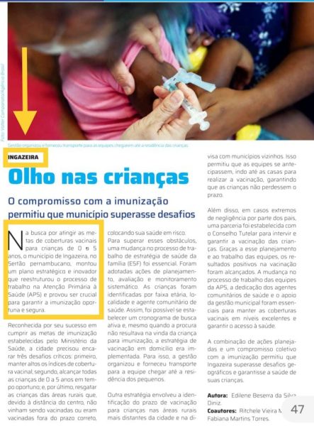 Você sabia? – Que o município de Ingazeira mais uma vez se destaca e tem experiência exitosa na área da imunização relatada em Revista do Cosems PE. Após apresentar a experiência no Congresso de Secretarias Municipais de Saúde a experiência exitosa agora está expressa no editorial do Cosems mostrando o quanto um trabalho de qualidade, articulado e eficiente pode trazer benefícios para a população usuária do SUS. “Somos modelo na área da imunização e não mediremos esforços para garantir que nenhuma criança seja exposta a riscos e deixe de ser vacinada”, disse a Secretária Fabiana Torres.