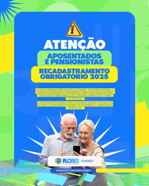Recadastramento – A Prefeitura de Flores, através do Fundo Previdenciário Municipal, informa que começa nesta quarta-feira 26 de novembro e vai até 19 de dezembro, o Recadastramento Anual dos Aposentados e Pensionistas referente ao ano de 2025, no horário das 08 às 12 horas, na sede do FUNPREF — Praça Dr. Santana Filho, nº 01. A atualização cadastral é obrigatória e essencial para garantir a segurança dos dados, a regularidade dos benefícios e a manutenção responsável do nosso Regime Próprio de Previdência Social. Para realizar o recadastramento, é necessário apresentar documentação original e cópia. Entre os documentos obrigatórios estão RG ou documento com foto, CPF, comprovante de residência atualizado, título de eleitor, dados bancários e, no caso de pensionistas, documentos específicos que comprovem a condição. Os beneficiários que estiverem impossibilitados de comparecer presencialmente poderão utilizar as alternativas previstas na Resolução, como representação por terceiro, mediante comprovação e documentação exigida. A falta de recadastramento dentro do prazo poderá ocasionar a suspensão temporária do benefício, sendo a reativação condicionada à regularização.