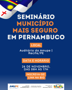 1º Seminário – A Secretaria Nacional de Segurança Pública (Senasp/MJSP) e a Associação Municipalista de Pernambuco (Amupe) realizam, nesta quarta-feira (26/11), o 1º Seminário do Programa Município Mais Seguro em Pernambuco, das 8h às 17h, na sede da Amupe. Pernambuco será o primeiro estado do país a receber o seminário, que aprofunda as ações do programa lançado em outubro pelo Ministério da Justiça e Segurança Pública, que anunciou mais de R$ 171 milhões em investimentos. O encontro reunirá mais de 200 integrantes de guardas municipais de 12 municípios, com programação técnica e formativa ao longo do dia.