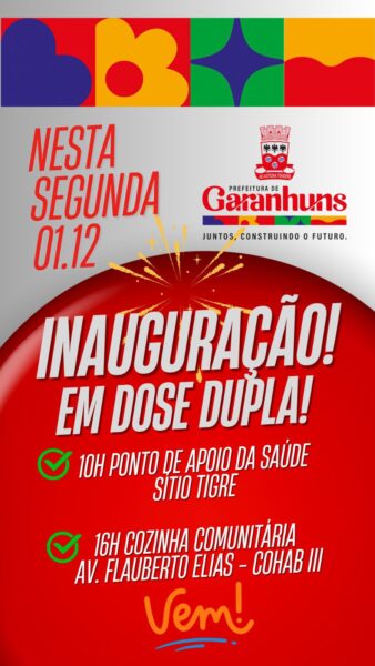 Inaugurações em Dose Dupla – A Prefeitura de Garanhuns realiza nesta segunda-feira, 1º de dezembro, inaugurações em Dose Dupla. Às 10 horas, a Secretaria de Saúde entrega a requalificação do Ponto de Apoio do Sítio Tigre. E às 16 horas, a Secretaria de Assistência Social e Direitos Humanos inaugura mais uma Cozinha Comunitária no município, desta vez na Av. Flauberto Elias, avenida principal da Cohab III. Serão mais de 200 refeições diariamente para famílias em situação de insegurança alimentar. A Cozinha é uma parceria com o Governo do Estado, através do Programa Bom Prato.