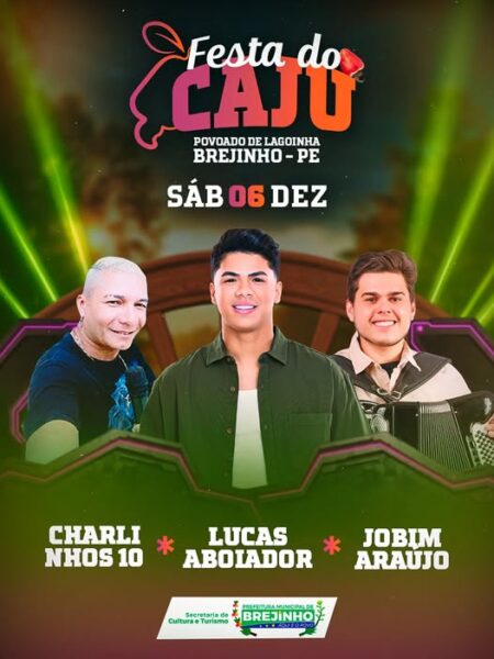 Anunciou – O prefeito de Brejinho, Gilson Bento, anunciou a programação da tradicional Festa do Caju no Povoado de Lagoinha, que será realizada no próximo dia 06 de dezembro. Estarão se apresentando, Charlinho 10, Lucas Aboiador e Jobim Araújo. “Mais uma festa promovida pela Gestão Municipal de Brejinho, através da Secretaria de Cultura e Turismo, que valoriza nossas raízes, fortalece as tradições locais e celebra a cultura do nosso povo”, disse o prefeito.