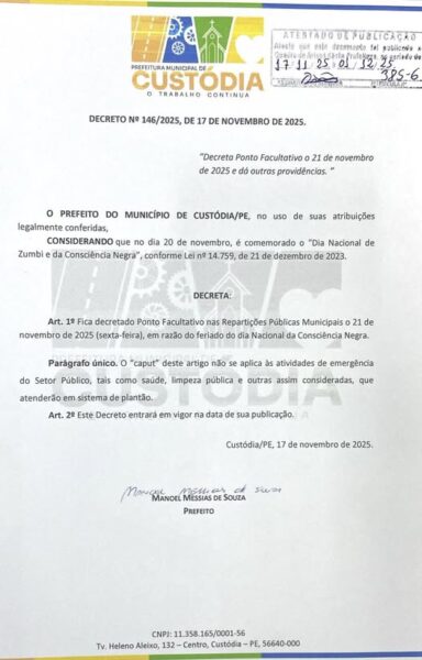 Destaque – O município de Custódia, voltou a ser destaque ao receber das mãos da governadora Raquel Lyra o Prêmio IDEPE, reconhecimento pelo avanço da educação local. Escolas municipais, estaduais e a unidade quilombola foram premiadas, resultado do trabalho conjunto de profissionais, famílias e da gestão municipal, além de receber novas viaturas e armamentos ao BEPI, reforçando a segurança no Sertão.