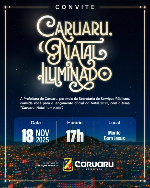 Lançamento oficial – A Prefeitura de Caruaru, por meio da Secretaria de Serviços Públicos, convida a imprensa e o público em geral para o lançamento oficial do Natal 2025, que traz o tema “Caruaru, Natal Iluminado”. O evento será realizado nesta terça-feira (18), às 17h, no Monte Bom Jesus. A cerimônia marca o acendimento das luzes natalinas, que, neste ano, contempla 20 localidades na zona urbana e rural. A presença de todos é fundamental para dar início à retomada do Natal de Caruaru como uma das maiores celebrações natalinas de Pernambuco.