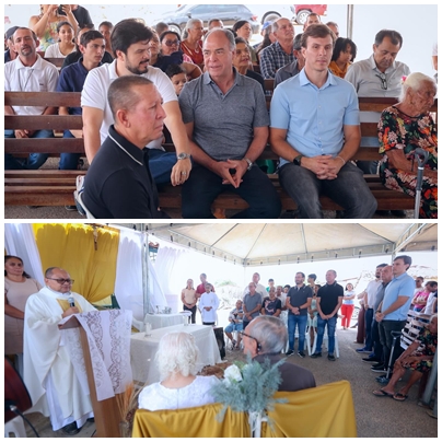 Prestigiaram – O ex-senador Fernando Bezerra Coelho, acompanhados dos seus filhos o deputado federal Fernando Filho e o ex-prefeito de Petrolina, Miguel Coelho, participaram neste domingo (23), da missa em ação de graças pelos 75 anos de casamento dos amigos – Dona Josefa e Seu Inácio, na comunidade de Bom Jardim na zona rural de Petrolina.