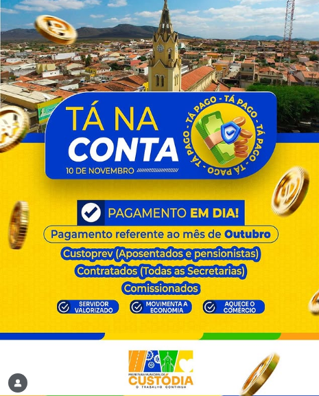 Dinheiro na conta – A Prefeitura de Custódia, realizou nesta segunda-feira (10), o pagamento referente ao mês de Outubro, de todas as Secretárias, Comissionados, Contratados, Aposentados e Pensionistas.