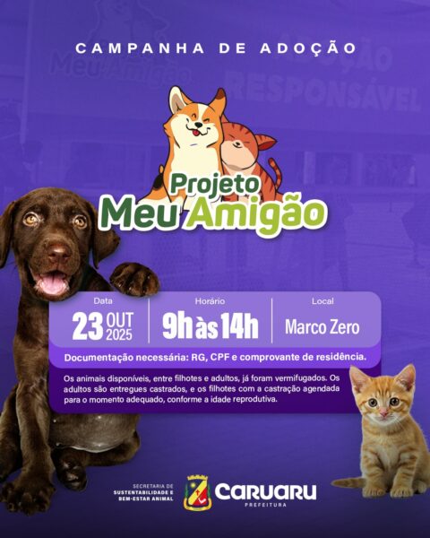 Meu amigão – A Prefeitura de Caruaru, por meio da Secretaria de Sustentabilidade e Bem-Estar Animal (SSB), realiza, nesta quinta-feira (23), mais uma edição do projeto “Meu Amigão”, que promove a adoção responsável de cães e gatos resgatados pela AME Animal. A ação será realizada no Marco Zero, das 9h às 14h, reunindo pets devidamente vacinados, vermifugados e prontos para ganhar um novo lar. Os adultos já estão castrados e os filhotes têm a castração garantida quando atingirem a idade para a realização do procedimento.