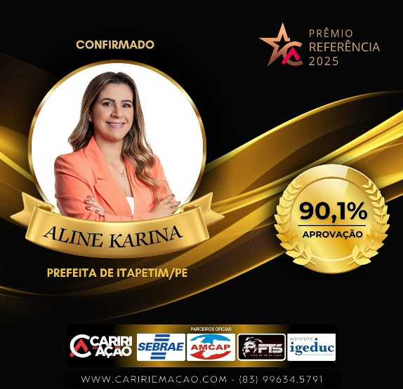 Você sabia? – Que a prefeita de Itapetim, Aline Karina, vai receber o Prêmio Referência 2025, promovido pelo Blog Cariri em Ação, com 90,1% de aprovação popular em votação. “Esse resultado não é apenas um número — é o reflexo do trabalho, do compromisso e da dedicação de toda a nossa equipe. É também o reconhecimento do povo que acredita, participa e constrói junto conosco uma Itapetim cada vez melhor”, pontuou a gestora.