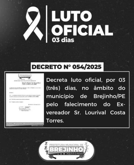 Luto oficial – O prefeito de Brejinho, Gilson Bento, decretou ‘Luto Oficial’, de três dias em virtude da morte do ex-vereador Sr. Lourival Costa Torres. “Manifestamos nossos mais sinceros sentimentos de pesar e solidariedade aos familiares e amigos neste momento de dor”, disse o gestor.