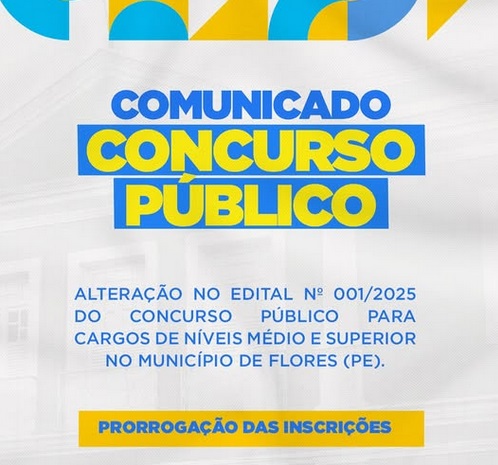 Prorrogou – O Governo Municipal de Flores, no Sertão do Pajeú, comunica a prorrogação do prazo de inscrições para o Concurso Público – Edital n° 001/2025. O prazo final para se inscrever será até o dia 24 de novembro. O certame disponibiliza um total de 43 vagas para diversos níveis. Para mais detalhes sobre requisitos e salários, acesse o Edital completo. Não perca o novo prazo. Confira o Edital e mais informações em: https://flores.pe.gov.br