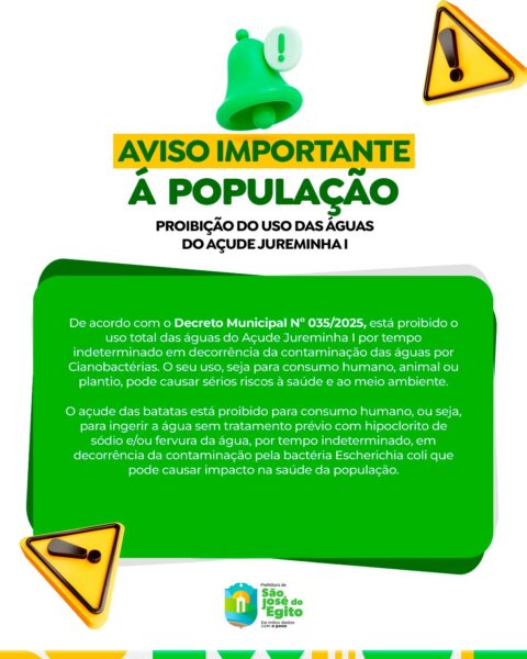 Retificação de Informação – A Prefeitura Municipal de São José do Egito informa que a proibição total de uso da água é apenas da Barragem de Jureminha I. A medida foi adotada para garantir a segurança da população e a preservação da qualidade da água.