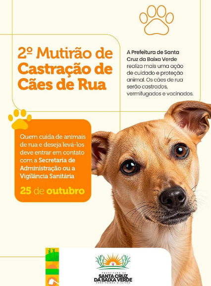 Mutirão – A Prefeitura de Santa Cruz da Baixa Verde realiza no próximo dia 25 de outubro, o 2º Mutirão de Castração de Cães de Rua, uma ação importante de controle populacional, cuidado e saúde animal no município. O mutirão tem como objetivo reduzir o número de cães abandonados e prevenir doenças, garantindo mais qualidade de vida para os animais e segurança para a população. Durante a ação, os cães de rua serão castrados, vermifugados e vacinados, recebendo todo o acompanhamento necessário da equipe responsável.