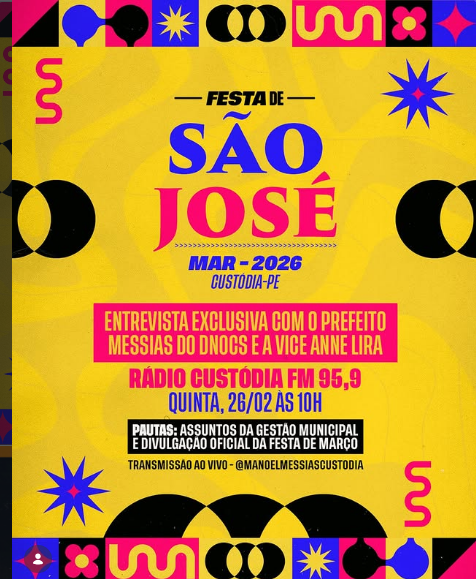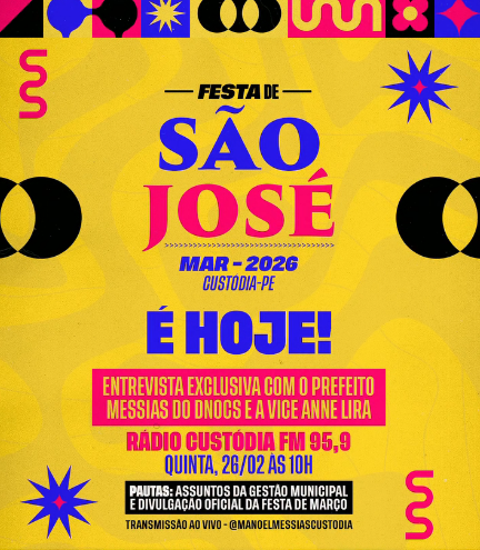 É Hoje – O prefeito de Custódia, Manoel Messias, anuncia nesta quinta-feira em entrevista exclusiva na Rádio Custódia FM 95,9, às 10 horas, a programação artística da tradicional Festa de São José que vai ocorrer entre os dias 13 a 18 de Março.