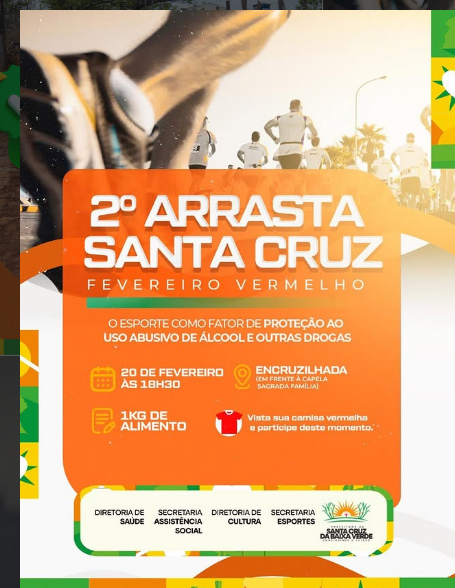 É hoje – O Governo Municipal de Santa Cruz da Baixa Verde, realiza nesta sexta-feira (20), às 18:30 horas, o 2º Arrasta Santa Cruz – Fevereiro Vermelho. “Um momento para mostrar que o esporte é um caminho de proteção, saúde e consciência. Escolher o esporte é escolher uma vida com mais foco, superação e longe do uso abusivo de álcool e outras drogas”, disse o prefeito Dr Ismael. A concentração será na Encruzilhada em frente a Capela Sagrada Família.
