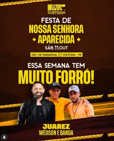 Anunciou – O prefeito de Custódia, Manoel Messias, anunciou a programação artística da tradicional Festa de Nossa Senhora Aparecida do Distrito de Maravilha, que será no próximo sábado (11). Estarão se apresentando o cantor Juarez e Wedsob e Banda.