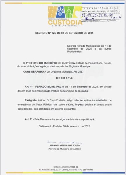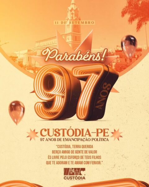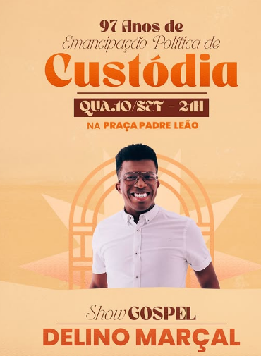 Hoje – Iniciando a programação dos 97 anos de Emancipação Política de Custódia, hoje às 21 horas na Praça Padre Leão, haverá o Show Gospel com Delino Marçal. “Convidamos a todos para um momento especial de fé e celebração”, disse o prefeito Manoel Messias.