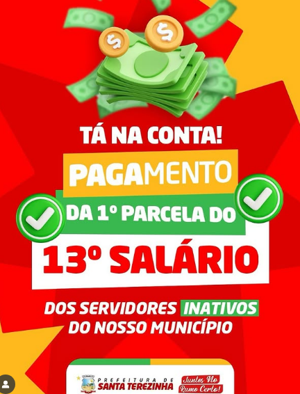Você sabia? – Que a Prefeitura de Santa Terezinha realizou o pagamento da 1ª parcela do 13º salário dos servidores inativos do município. Mais um compromisso cumprido com responsabilidade e respeito!