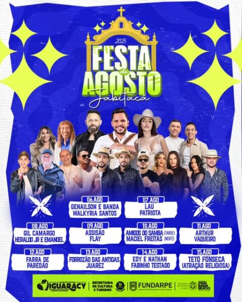 Anunciou programação – O prefeito de Iguaracy, Dr. Pedro Alves, anunciou nesta quarta-feira (23) a programação oficial da tradicional Festa de Agosto do Distrito de Jabitacá, que vai acontecer dos dias 06 à 15 de agosto, que conta com o apoio do Governo de Pernambuco, através da Fundarpe e da Secretaria de Turismo e Lazer. Confira a programação: 06 de agosto (quarta-feira): Genailson e Banda/Walkyria Santos, 07 de agosto (quinta-feira): Lau Patriota, 08 de agosto (sexta-feira): Gil Camargo/ Heraldo Jr. e Emanuel, 09 de agosto (sábado): Assisão/Flay, 10 de agosto (domingo): à tarde: Amigos do Samba e a noite Maciel Freitas, 11 de agosto (segunda-feira) Artur Vaqueiro, 12 de agosto (terça-feira) Farra de Paredão, 13 de agosto (quarta-feira) Forrozão das Antigas/Juarez, 14 de agosto (quinta-feira) Edy e Nathan/Fabinho Testado e no encerramento dia 15 de agosto (sexta-feira) Teto Fonseca (atração religiosa).