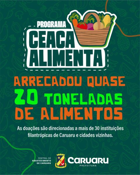 Arrecadados – A Prefeitura de Caruaru, por meio da Central de Abastecimento de Caruaru (Ceaca), segue auxiliando famílias e instituições de caridade localizadas no município e em cidades circunvizinhas, por meio do programa Ceaca Alimenta. No primeiro semestre de 2025, foram arrecadadas, com a parceria de comerciantes e colaboradores, quase 20 toneladas de comida. As doações serão direcionadas a mais de 30 instituições filantrópicas de Caruaru e cidades vizinhas. Os produtos mais doados no primeiro semestre foram mamão, melancia, coentro, jaca, banana prata, manga, goiaba, abacate, cenoura, cebola branca, tomate, maçã, graviola e acerola. Além de pitomba, quiabo, pinha, laranja, pimenta de cheiro, pepino, vagem e siriguela.