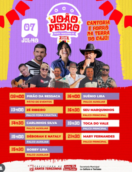 Encerra hoje – Será nesta segunda-feira (07), o encerramento do tradicional João Pedro, da cidade de Santa Terezinha-PE. A programação terá início com o ‘pirão da ressaca’ às 08 horas no Pátio de Eventos, Às 13 horas, terá a apresentação de Zé Ribeiro no Palco da Feira Criativa, em seguida vem 14:30 horas, Carlinhos Silva, 15 horas Déborah e Nataly, 15:30 horas Boby Lira e 16 horas Suênio Lira, às 16:30 horas no palco principal Seu Marquinhos, às 18:30 horas Toca do Vale e encerrando com chave de ouro o João Pedro 2025, às 21:30 horas, Mary Fernandes.