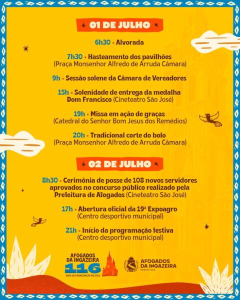 Amanhã – Afogados da Ingazeira, comemora nesta terça-feira 1º de Julho, 116 anos de sua emancipação política, e a Prefeitura Municipal, emitiu a programação oficial. Confira abaixo