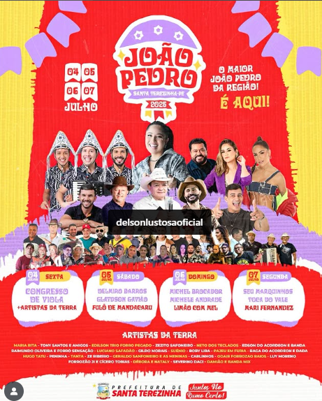 Programação oficial – O prefeito de Santa Terezinha, Delson Lusosa, anunciou oficialmente a programação do tradicional João Pedro 2025, que terá início no próximo dia 04 de julho e se encerra no dia 07. SEXTA-FEIRA – 04/07: Congresso de Viola + Artistas da Terra, SÁBADO – 05/07: Delmiro Barros, Glaydson Gavião e Fulô de Mandacaru; DOMINGO – 06/07: Limão com Mel, Michele Andrade e Michel Brocador; na Segunda-feira (07) encerrando as festividades, Seu Marquinhos, Toca do Vale e Mari Fernandez. “Vem viver essa festa linda com a gente, é tradição, é cultura, é alegria que não acaba mais, no João Pedro 2025 em Santa Terezinha-PE”, disse o prefeito Delson.