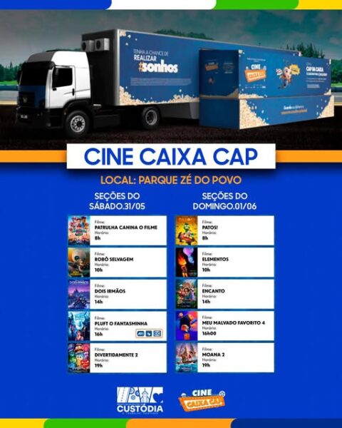 Cinema – A Prefeitura de Custódia, está trazendo para seus munícipes, o Cine Caixa Cap é um projeto itinerante de cinema gratuito promovido pela CAIXA Capitalização, que leva sessões de filmes para diversas cidades do Brasil. Ele é conhecido por democratizar o acesso à cultura e levar o cinema a lugares onde não há salas de cinema. “A população custodiense, terá a oportunidade neste sábado (31) e Domingo (01), de assistir às sessões de filmes de diversos segmentos, a carreta estará no Parque Zé do Povo”, disse o prefeito Manoel Messias.