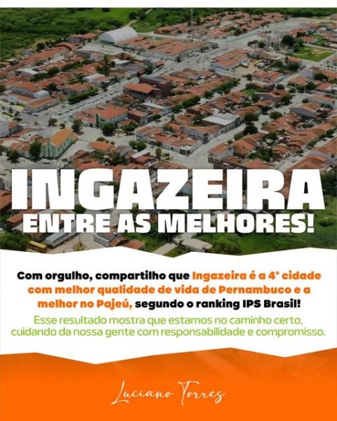 Entre as melhores – O município de Ingazeira é reconhecido como um lugar ideal para viver, graças à sua qualidade de vida, infraestrutura e a uma administração dedicada ao bem-estar de seus moradores. De acordo com o Índice de Progresso Social (IPS Brasil 2024), uma metodologia que avalia a qualidade de vida da população brasileira de forma multidimensional, Ingazeira atingiu uma pontuação de 62,88/100, demonstrando bom desempenho em diversos indicadores sociais, econômicos e ambientais. O IPS avalia aspectos como necessidades humanas básicas, saúde, educação, acesso ao conhecimento, meio ambiente, segurança, direitos humanos e oportunidades, oferecendo uma visão ampla do progresso social do município. “Nosso compromisso é garantir uma qualidade de vida superior para todos, com transparência, responsabilidade e dedicação”, disse o prefeito Luciano Torres.