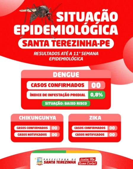 Divulgando – A Prefeitura de Santa Terezinha-PE, atualizou a Epidemiológica no município. Não foi registrado nenhum caso confirmado de dengue até a 11ª semana epidemiológica. O Índice de Infestação Predial está em 0,8%, indicando baixo risco, além disso, não registramos casos de chikungunya ou zika.