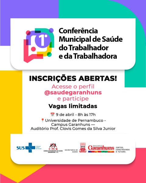 Conferência – Estão abertas as inscrições para a 1ª Conferência Municipal de Saúde do Trabalhador e da Trabalhadora (1ª CMTTS), promovida pelo Conselho Municipal de Saúde e pela Secretaria de Saúde de Garanhuns. O evento será no próximo dia 9 de abril, das 8h às 17h, no auditório da UPE Garanhuns. As inscrições devem ser realizadas através do link https://docs.google.com/forms/d/e/1FAIpQLSdXgssf9nlfILsXRyb26qmW6bBhN5qOE9-sCabTwycZs8cjuQ/viewform. Com o tema “Saúde do Trabalhador e da Trabalhadora Pernambucana como Direito Humano”, a conferência tem como objetivo discutir e elaborar propostas que serão levadas para as etapas estadual e nacional. Serão destinadas 100 vagas para participação de representantes dos segmentos usuários, gestores e trabalhadores do SUS.