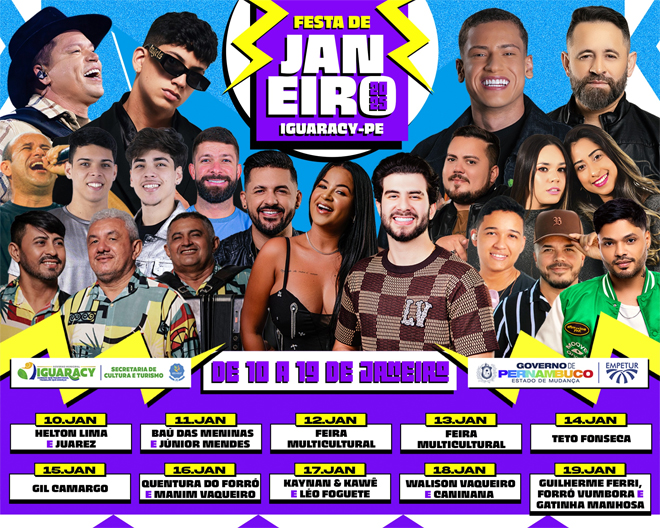 Anunciou programação – O prefeito de Iguaracy, Dr. Pedro Alves anunciou em suas redes sociais a programação completa da tradicional Festa de Janeiro, que acontecerá de 10 a 19 de janeiro na Praça Antônio Rabelo, em Iguaracy, que conta com o apoio do Governo do Estado de Pernambuco e da Empetur.