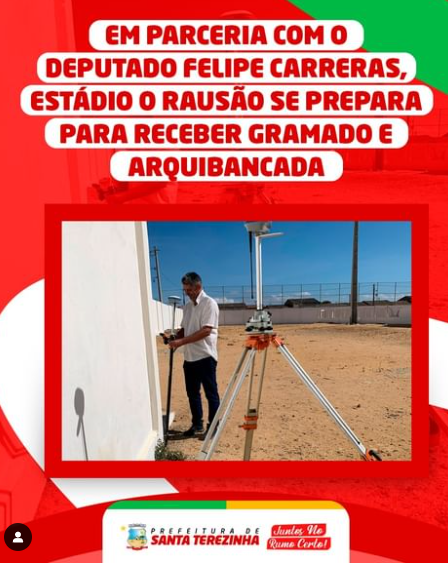 Você sabia? – Que a Prefeitura Municipal de Santa Terezinha, em parceria com o deputado federal Felipe Carreras, já estão com o andamento do gramado e arquibancadas do Estádio ‘O Rausão”, que vai elevar o esporte para os futebolístico do município, dando um dinâmica e conforto maior para todos.