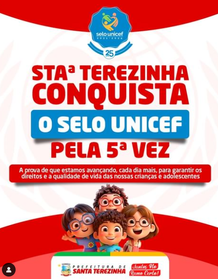 Você sabia? – Que o município de Santa Terezinha, vai receber o Selo Unicef pela 5ª vez. “Esse reconhecimento é resultado do compromisso e trabalho incansável da nossa gestão em garantir os direitos das crianças e adolescentes. O Selo UNICEF é uma iniciativa que fortalece as políticas públicas municipais em áreas essenciais, como educação, saúde e proteção. Com esse selo, reafirmamos nosso compromisso em construir um futuro melhor para as nossas crianças e adolescentes”, disse o prefeito Delson Lustosa.