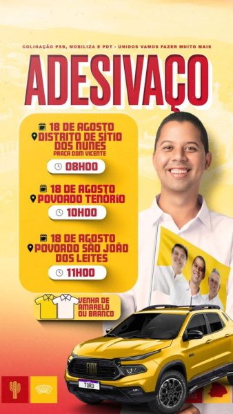 Anunciou – O prefeito de Afogados da Ingazeira, candidato a reeleição Sandrinho Palmeira (PSB), anunciou eventos para o próximo sábado (24), às 8:30 horas, adesivaço e uma motorata da Frente Popular a noite às 19 horas, inauguração do seu Comitê de Campanha, na Avenida Rio Branco, antigo Bar de Naldinho Quidute.