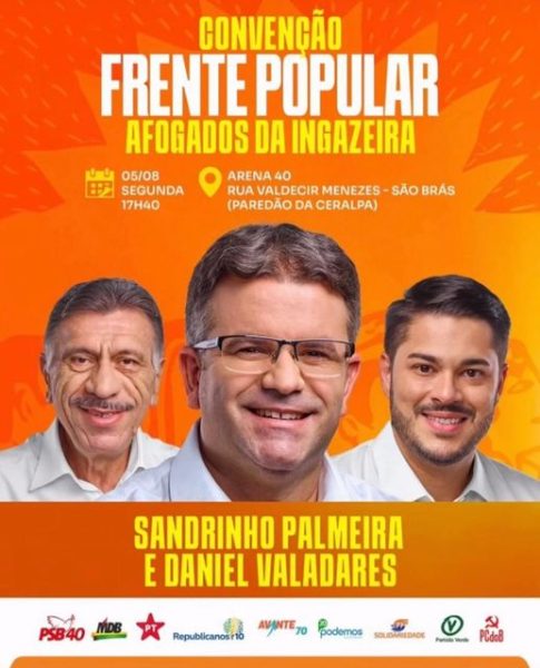 Hoje – A Frente Popular de Afogados da Ingazeira, realiza nesta segunda-feira (05), a sua convenção que vai homologar Sandrinho Palmeira candidato a reeleição e Daniel Valadares, vice-prefeito, além de vereadores (as). O evento será no paredão da Ceralpa no Bairro São Braz às 17:40 horas, com as presenças do prefeito do Recife, João Campos e do deputado federal, Pedro Campos